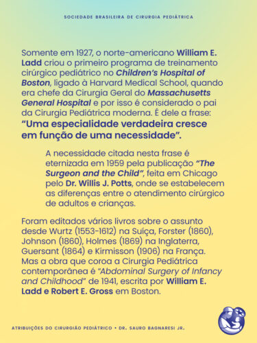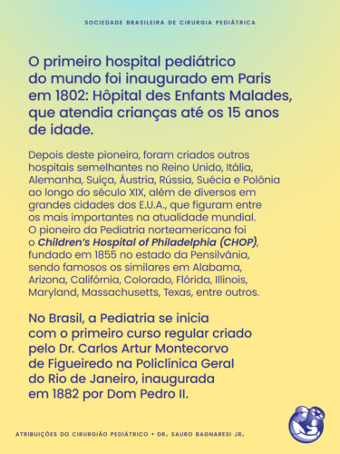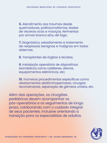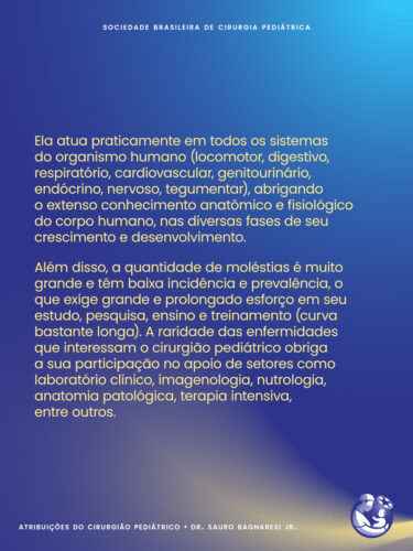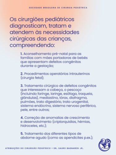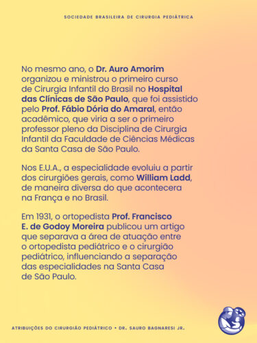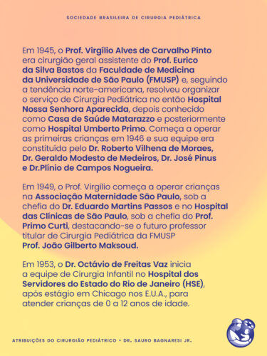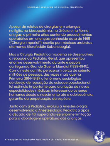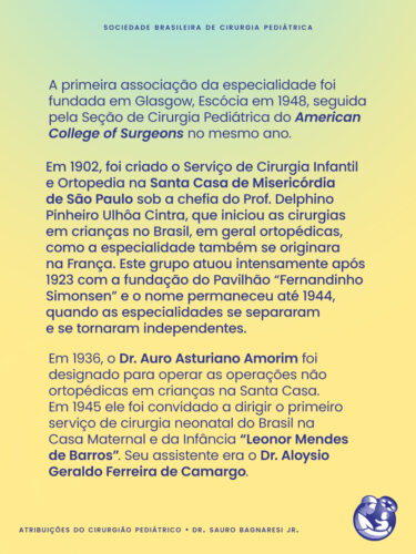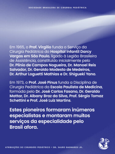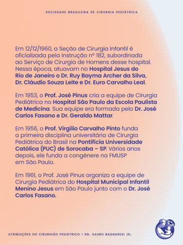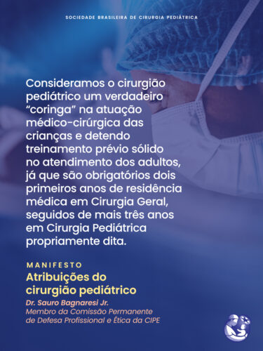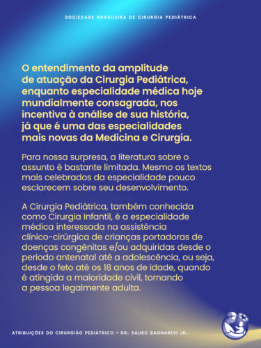 Para compreender sua história, evolução e a real extensão de seu campo de atuação, este manifesto elaborado pelo Dr. Sauro Bagnaresi Jr., membro da Comissão Permanente de Defesa Profissional e Ética é um conteúdo que resgata as raízes da especialidade, contextualiza sua formação no Brasil e no mundo, e descreve de forma precisa as atribuições do cirurgião pediátrico.